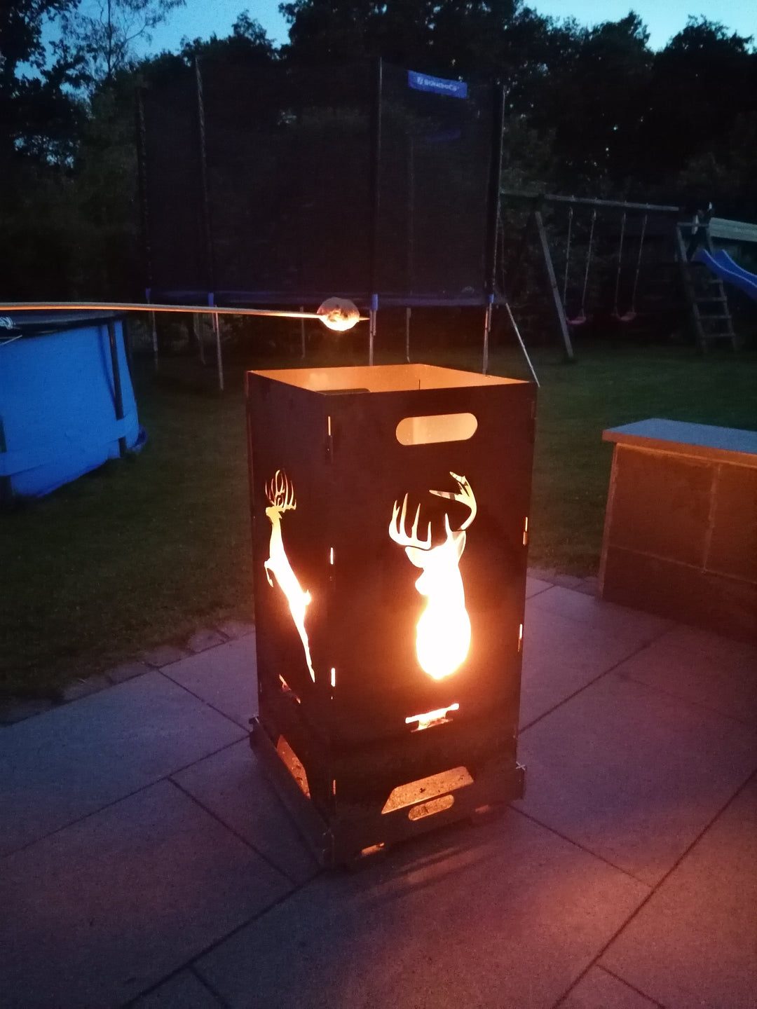 Sehr hochwertige und stabile Feuertonne aus 3 mm Stahlblech die wir in Handarbeit selber herstellen. Einfaches Stecksystem mit praktischen Tragegriffen. Jeweils die gegenüberliegenden Seiten sind mit dem gleichen Motiv versehen.