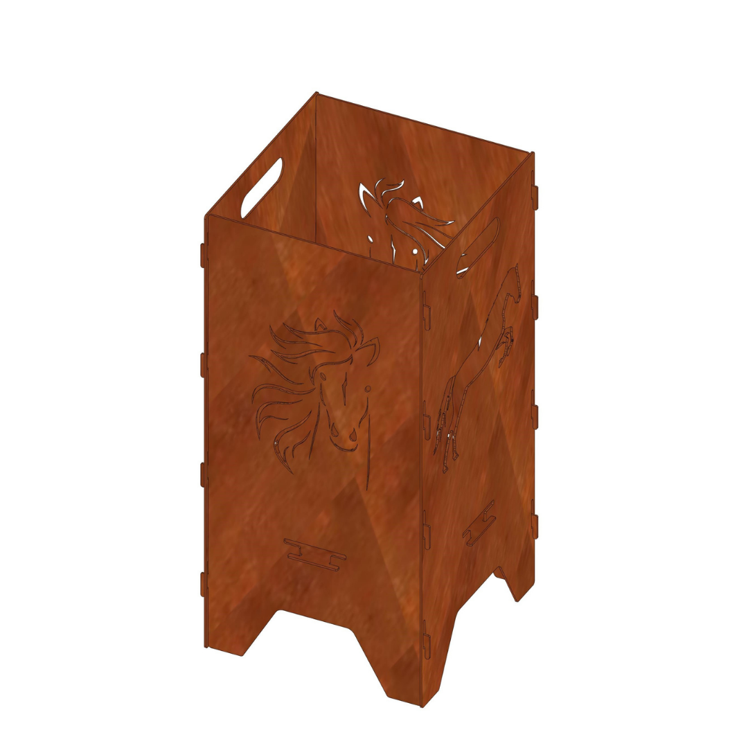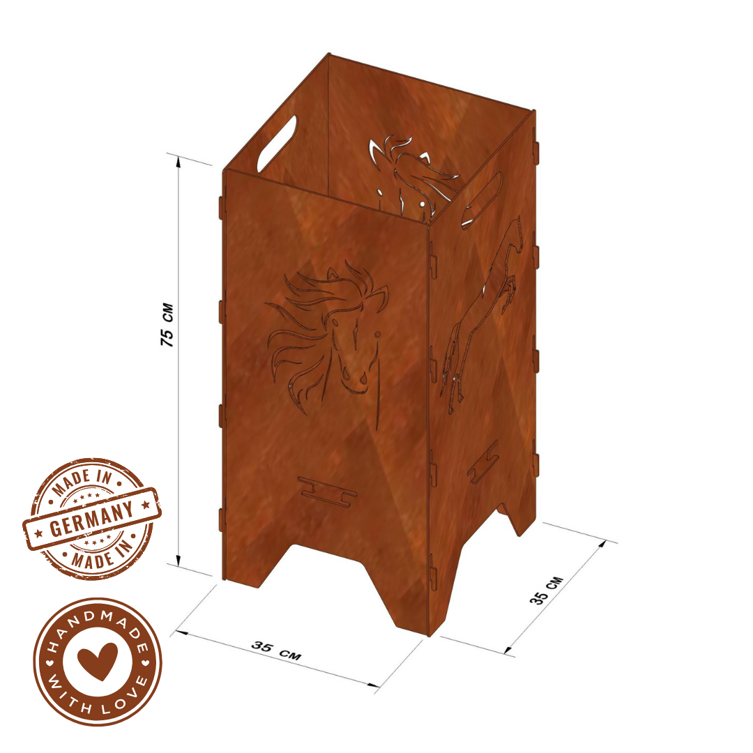 Die Feuertonne Pferd ist Ideal für alle Fans von Pferden und des Reitsports. Das Motiv kommt besonders gut zur Geltung sobald das Feuer darin brennt.